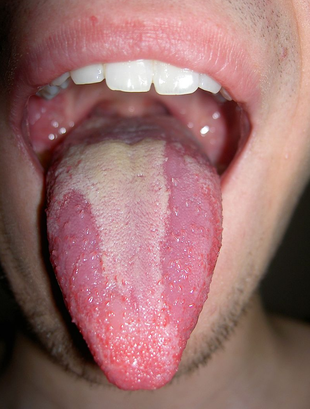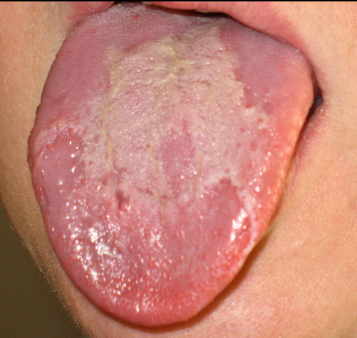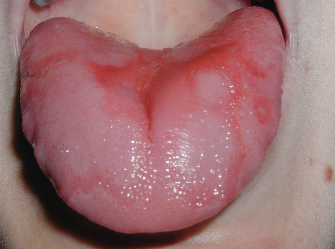 There are usually no symptoms other than the unusual appearance of the tongue, but in some cases persons may experience pain or burning, e.g. when eating hot, acidic, spicy or other kinds of foods (e.g. cheese, tomatoes, fruit).[3][4] Where there is a burning symptom, other causes of a burning sensation on the tongue are considered, such as oral candidiasis.[5]