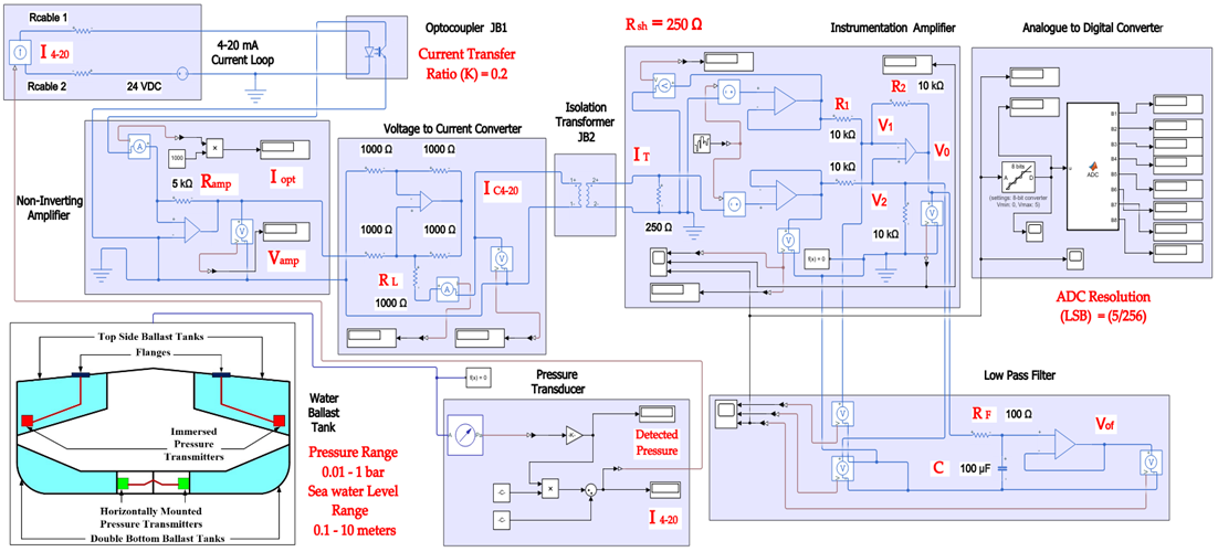 In maritime engineering applications, improved performance of instrumentation systems can be basically provided by adopting techniques to enhance the reliability of measurement/control systems based on the 4–20 mA analogue standard. This aspect will be discussed through a Simscape Simulink model illustrating methods of noise and ground loops elimination for a 4–20 mA pressure measurement current loop in the tank level measurement system on a bulk carrier commercial ship. Alternatively, improved measurement and control processes can be rendered by utilizing smart transmitters based on wired digital Foundation Fieldbus (FF) protocol. A simulation-based case study will analyze the possible options to implement non-intrinsically safe as well as intrinsically safe FF models for the tank level measurement system on a bulk carrier commercial ship. Conclusions obtained through analysis of the simulation results will characterize the behavior of FF segments in safe as well as explosive hazardous areas, highlighting the characteristics of field barriers and segment protectors used in conjunction with the HPTC (High-Power Trunk Concept) intrinsically safe model.