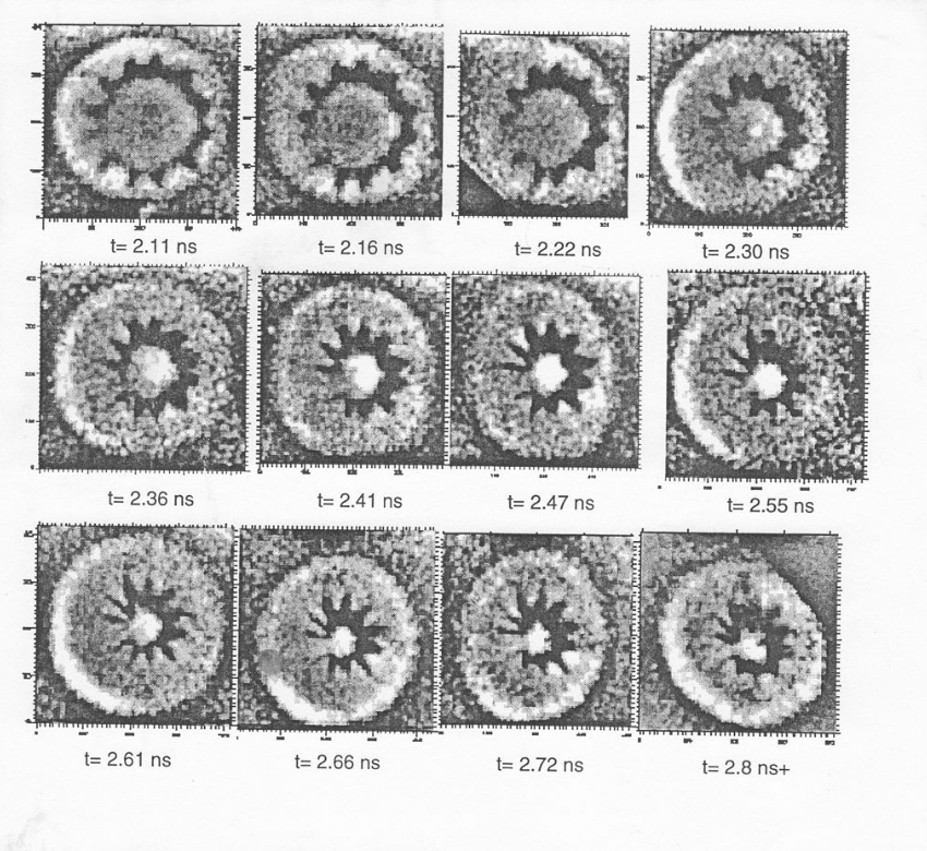 In order to focus the shock wave on the center of the target, the target must be made with extremely high precision and sphericity with aberrations of no more than a few micrometres over its surface (inner and outer). Likewise the aiming of the laser beams must be extremely precise and the beams must arrive at the same time at all points on the target. Beam timing is a relatively simple issue though and is solved by using delay lines in the beams' optical path to achieve picosecond levels of timing accuracy. The other major problem plaguing the achievement of high symmetry and high temperatures/densities of the imploding target are so called "beam-beam" imbalance and beam anisotropy. These problems are, respectively, where the energy delivered by one beam may be higher or lower than other beams impinging on the target and of "hot spots" within a beam diameter hitting a target which induces uneven compression on the target surface, thereby forming Rayleigh-Taylor instabilities[3] in the fuel, prematurely mixing it and reducing heating efficacy at the time of maximum compression. The Richtmyer-Meshkov instability is also formed during the process due to shock waves being formed.