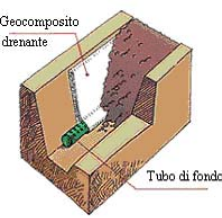 Shallow drainage trenches may also be equipped with geocomposites. The scarped sides of the trenches are covered with geocomposite panels. The bottom of the trenches houses a drainage tube placed in continuity to the geocomposite canvas.