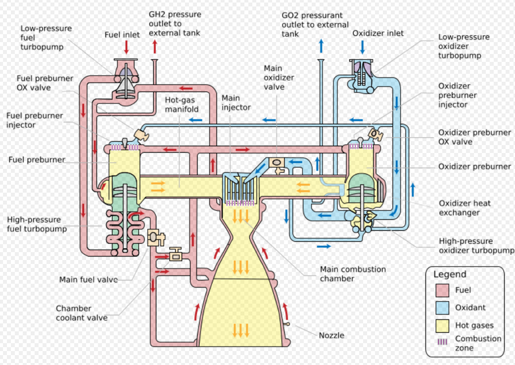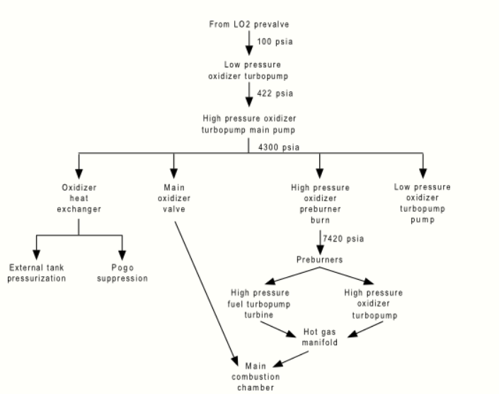 Once in the engine, the propellants flow through low-pressure fuel and oxidizer turbopumps (LPFTP and LPOTP), and from there into high-pressure turbopumps (HPFTP and HPOTP). From these HPTPs the propellants take different routes through the engine. The oxidizer is split into four separate paths: to the oxidizer heat exchanger, which then splits into the oxidizer tank pressurization and pogo suppression systems; to the low pressure oxidizer turbopump (LPOTP); to the high pressure oxidizer preburner, from which it is split into the HPFTP turbine and HPOTP before being reunited in the hot gas manifold and sent on to the main combustion chamber (MCC); or directly into the main combustion chamber (MCC) injectors.