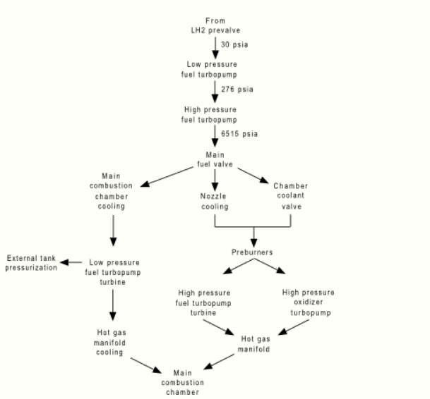 The HPFTP is a three-stage centrifugal pump driven by a two-stage hot-gas turbine. It boosts the pressure of the liquid hydrogen from 1.9 to 45 MPa (276 to 6,515 psia), and operates at approximately 35,360 rpm with a power of 71,140 hp. The discharge flow from the turbopump is routed to, and through, the main valve and is then split into three flow paths. One path is through the jacket of the main combustion chamber, where the hydrogen is used to cool the chamber walls. It is then routed from the main combustion chamber to the LPFTP, where it is used to drive the LPFTP turbine. A small portion of the flow from the LPFTP is then directed to a common manifold from all three engines to form a single path to the liquid hydrogen tank to maintain pressurization. The remaining hydrogen passes between the inner and outer walls of the hot-gas manifold to cool it and is then discharged into the main combustion chamber. A second hydrogen flow path from the main fuel valve is through the engine nozzle (to cool the nozzle). It then joins the third flow path from the chamber coolant valve. This combined flow is then directed to the fuel and oxidizer preburners. The HPFTP is approximately 550 by 1,100 mm (22 by 43 in) in size and is attached to the hot-gas manifold by flanges.[1]