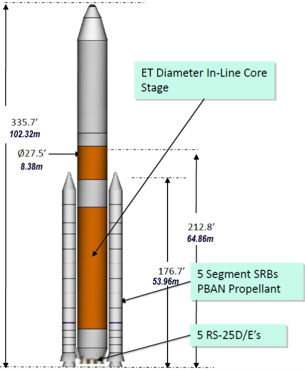 Following the retirement of the Space Shuttle, NASA announced on September 14, 2011, that it would be developing a new launch vehicle, known as the Space Launch System (SLS), to replace the shuttle fleet.[43] The design for the SLS features the RS-25 on its core stage, with different versions of the rocket being installed with between three and five engines.[44][45] The initial flights of the new launch vehicle will make use of flown Block II RS-25D engines, with NASA keeping the remaining such engines in a "purged safe" environment at Stennis Space Center, "along with all of the ground systems required to maintain them."[46][47] In addition to the RS-25Ds, the SLS program will make use of the Main Propulsion Systems from the three remaining orbiters for testing purposes (having been removed as part of the orbiters' decommissioning), with the first two launches (SLS-1 and SLS-2) possibly making use of the MPS hardware from Space Shuttles Atlantis and Endeavour in their core stages.[45][47][48] The SLS's propellants will be supplied to the engines from the rocket's core stage, which will consist of a modified Space Shuttle external tank with the MPS plumbing and engines at its aft, and an interstage structure at the top.[2] Once the remaining RS-25Ds are used up, they are to be replaced with a cheaper, expendable version, currently designated the RS-25E.[2] This engine may be based on one or both of two single-use variants which were studied in 2005, the RS-25E (referred to as the 'Minimal Change Expendable SSME') and the even more simplified RS-25F (referred to as the 'Low Cost Manufacture Expendable SSME'), both of which were under consideration in 2011.[30][49]