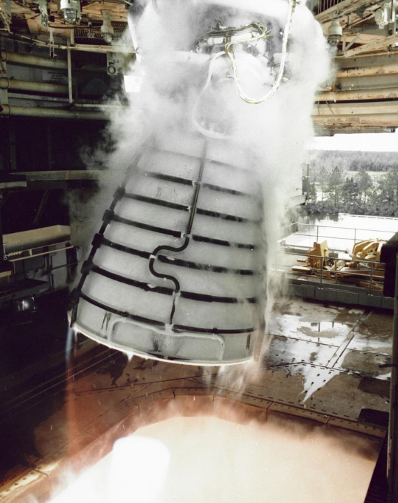 The history of the RS-25 traces back to the 1960s when NASA's Marshall Space Flight Center and Rocketdyne were conducting a series of studies on high-pressure engines, developed from the successful J-2 engine used on the S-II and S-IVB upper stages of the Saturn V rocket during the Apollo program. The studies were conducted under a program to upgrade the Saturn V engines, which produced a design for a 350,000 lbf upper-stage engine known as the HG-3.[16] As funding levels for Apollo wound down the HG-3 was cancelled as well as the upgraded F-1 engines already being tested.[17] It was the design for the HG-3 that would form the basis for the RS-25.[18]