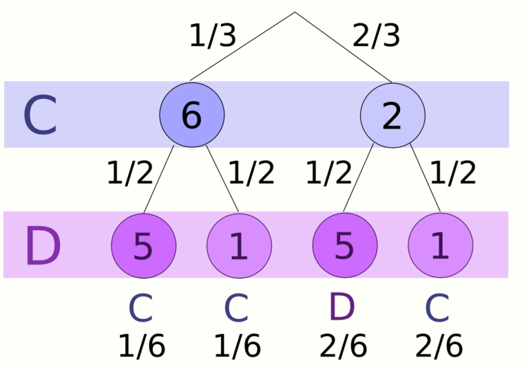 Finally, die D beats A two-thirds of the time but beats C only one-third of the time. The probability of die D beating B is 1/2 (only when D rolls 5). So the likelihood of D beating any other randomly selected die is: