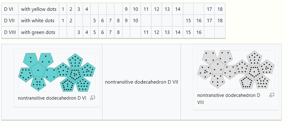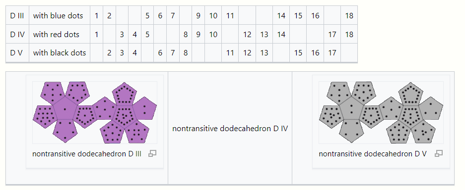 In analogy to the nontransitive six-sided dice, there are also dodecahedra which serve as nontransitive twelve-sided dice. The points on each of the dice result in the sum of 114. There are no repetitive numbers on each of the dodecahedra.