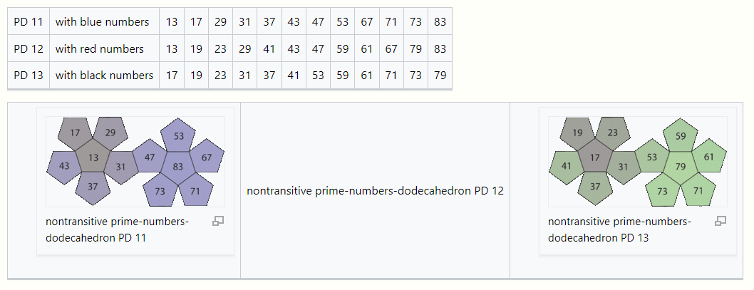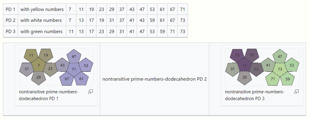 It is also possible to construct sets of nontransitive dodecahedra such that there are no repeated numbers and all numbers are primes. Miwin’s nontransitive prime-numbered dodecahedra win cyclically against each other in a ratio of 35:34.