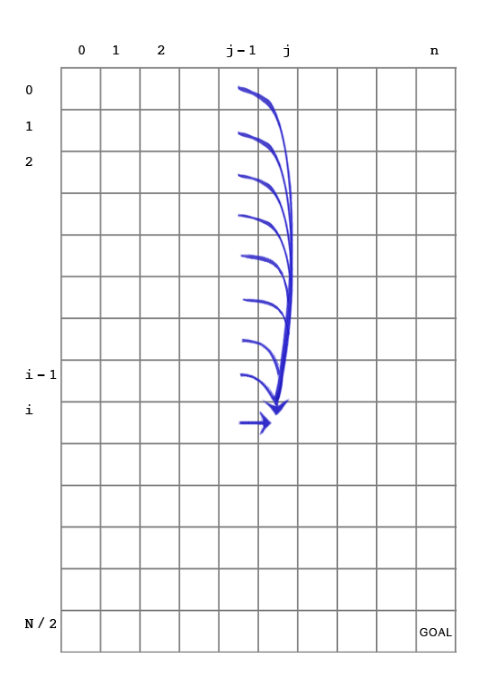 The algorithm consists of building up a table of size [math]\displaystyle{ \lfloor K/2 \rfloor }[/math] by [math]\displaystyle{ N }[/math] containing the values of the recurrence. Remember that [math]\displaystyle{ K }[/math] is the sum of all [math]\displaystyle{ N }[/math] elements in [math]\displaystyle{ S }[/math]. Once the entire table is filled in, we return [math]\displaystyle{ P(\lfloor K/2 \rfloor, N) }[/math]. Below is a depiction of the table [math]\displaystyle{ P }[/math]. There is a blue arrow from one block to another if the value of the target-block might depend on the value of the source-block. This dependence is a property of the recurrence relation.