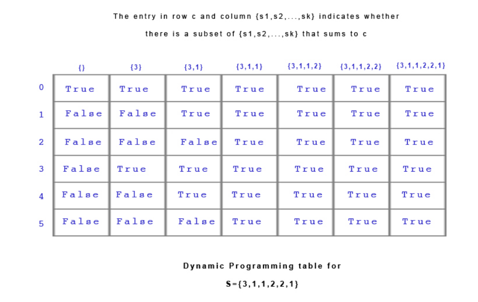 Below is the table P for the example set used above S = {3, 1, 1, 2, 2, 1}:
