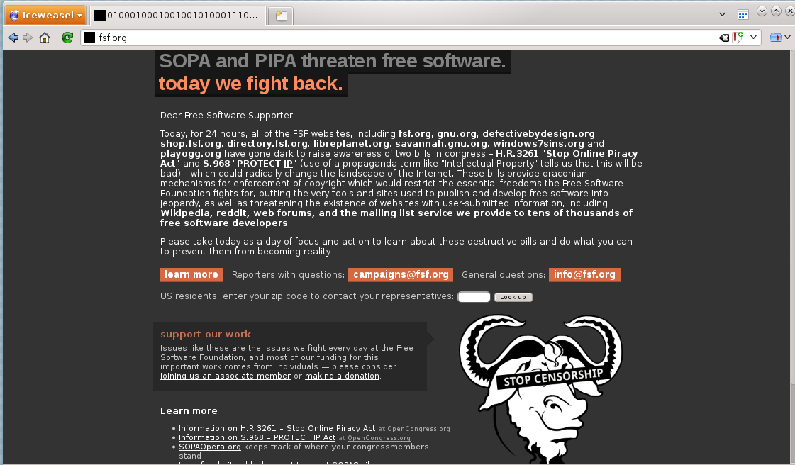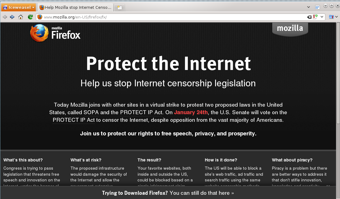 The Mozilla Foundation altered the default start page of their Firefox web browser, blacking it out and providing links with more information on the SOPA/PIPA bills and the opposition to them, and to allow users to email their Congressional representatives.[51]