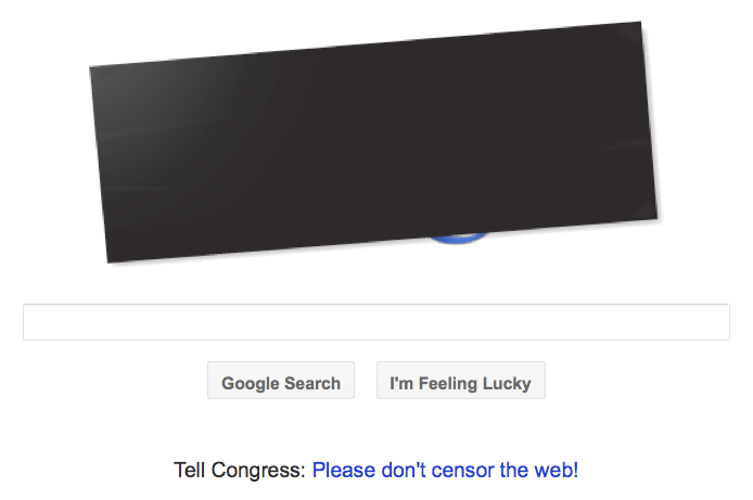 According to protest organizer Fight for the Future, more than 115,000 websites participated in the protest, including Google and Wikipedia.[5] Websites that participated in the blackout included Cheezburger, Craigslist, Boing Boing, A Softer World, Cake Wrecks, Cyanide & Happiness, Demand Progress, Destructoid, Entertainment Consumers Association. Free Press, Failblog, Newgrounds, Good.is, GOG.com, Gamesradar, Internet Archive, Marxists Internet Archive, Jay is Games, Mojang, MoveOn.org, Mozilla, MS Paint Adventures, Rate Your Music, Reddit, Roblox, Oh No They Didn't, Tucows, blip.tv, Tumblr, TwitPic, Twitter, The Oatmeal, VGMusic, Wikia, WordPress, the webcomic xkcd as well as the corporate site of the Linux distribution openSUSE and the congressional websites of Silicon Valley representatives Anna Eshoo and Zoe Lofgren.[46][47][48] Google announced their intention to join the blackout by altering their logo for US visitors for the day, almost entirely obscuring it with an interactive black redaction swath. Clicking through the specially designed logo took readers to an informational page about the bills, and the opportunity to sign a petition to be sent to Congress stating their concerns.[49][50]