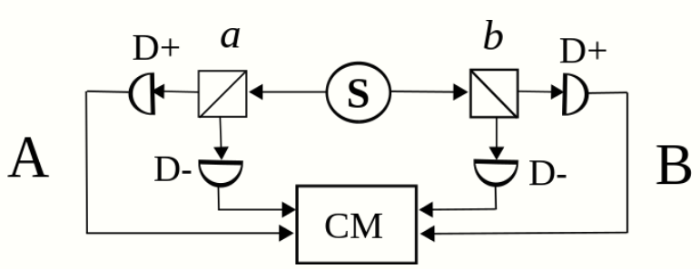 This is done with polarizer [math]\displaystyle{ a }[/math] rotated into two positions [math]\displaystyle{ a }[/math] and [math]\displaystyle{ a' }[/math], and polarizer [math]\displaystyle{ b }[/math] into two positions [math]\displaystyle{ b }[/math] and [math]\displaystyle{ b' }[/math], so that we get [math]\displaystyle{ E(a,b) }[/math], [math]\displaystyle{ E(a,b') }[/math], [math]\displaystyle{ E(a',b) }[/math] and [math]\displaystyle{ E(a',b') }[/math]. Then the following is calculated: