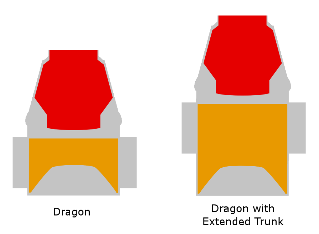 The Dragon capsule can transport 3,310 kilograms (7,300 lb) of cargo, which can be all pressurized, all unpressurized, or a combination thereof. It can return to Earth 3,310 kilograms (7,300 lb), which can be all unpressurized disposal mass, or up to 3,310 kilograms (7,300 lb) of return pressurized cargo, driven by parachute limitations. There is a volume constraint of 14 cubic metres (490 cu ft) trunk unpressurized cargo and 11.2 cubic metres (400 cu ft) of pressurized cargo (up or down).[63] The trunk was first used operationally on the Dragon's CRS-2 mission in March 2013.[64] Its solar arrays produce a peak power of 4 kW.[65]