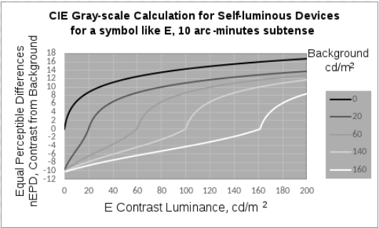 The Whittle calculation for self-luminous devices has a parameter, k, relating to the spatial scale of the symbol.[55] It (k) is the proportion (between 0 and 100%) of image contrast (target luminance minus background luminance) lost to intraocular scattering on the way to becoming a retinal image.[52] Reducing the angular subtense of a symbol always reduces the physical luminance difference between the symbol and its background (due to intraocular scattering), hence reducing legibility and conspicuousness and increasing k.[52] This parameter, k, can be calculated from optical principles,[57] as it was for the gray scale of the 10-arc-minute (k=0.2) optotype E represented in Figure 7. When symbol angular subtense (represented by k) is reduced, the optimum background luminance also is reduced.[57] The Whittle calculation is unaffected by highlights remote from the contrast, as verified experimentally.[64] The effect of remote highlights on grayscale appearance is due to intraocular scattering.[55]
