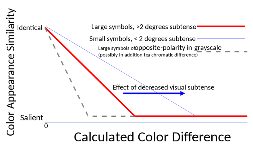 For these reasons, blue distinctions (involving colors on any tritan line,[43]) are lost for small symbols. This is called small-field tritanopia, which is a color deficiency for blueness-differences among small visual fields, to which everyone is subject. Hence, blueness differences should be discounted (or even eliminated from consideration) when selecting coding colors for small symbols, less than about 30 minutes of (i.e., the sun’s and moon’s) angular subtense.[44] Even color-differences not involving blueness appear to fade (however less than blue fades) when symbols diminish in size. For example, objects appear darker (less light) as they trend to a smaller visual subtense; larger areas with the same luminance appear lighter than smaller areas.[41] It is possible to estimate the effect of visual subtense on apparent color difference, including grayscale difference.[45] Smaller visual subtense of symbols implies fewer salient, or even discriminable, colors in the same display gamut.[41] Code colors will be salient if their color differences are at least 14 CIEDE2000 units for symbols having a two-degree visual subtense, or the equivalent color difference as estimated for smaller subtense.[45] For instance, salience of the 1.5-degree-by-0.75-degree visual-search targets used by Williams[19] improved for increases of their color differences to at least 21 CIEDE2000 units; beyond about 21 their salience did not improve further.[33] (The minimum color-difference values of salient colors given here correspond to the lower bound of the 95% confidence interval in the cited scientific literature.) The blue line and arrow in Figure 3 summarize the effect of small visual subtense (< 2 degrees of visual angle) on apparent color similarity, as a function of calculated color difference.[42] The visual angle subtended by a displayed symbol or other image segment can be precisely measured or calculated.