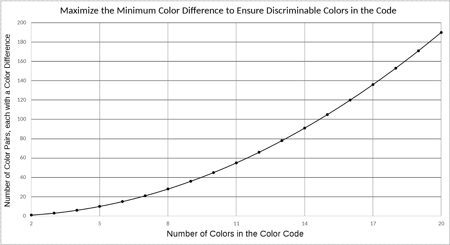In a code with n colors, there are n(n-1)/2 pairs of colors (see Figure 4), each pair having a color difference.[34] The proliferation of color differences, as the number of colors increases, necessitates a systematic, algorithmic and automated method of color selection.