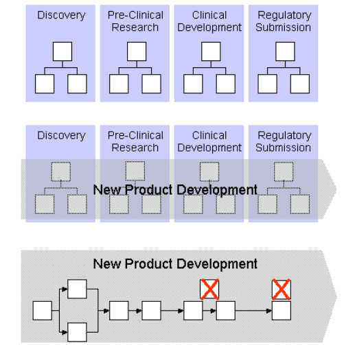Although the labels and steps differ slightly, the early methodologies that were rooted in IT-centric BPR solutions share many of the same basic principles and elements. The following outline is one such model, based on the PRLC (Process Reengineering Life Cycle) approach developed by Guha.[12] Simplified schematic outline of using a business process approach, exemplified for pharmaceutical R&D