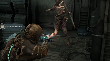 While exploring, Isaac must fight Necromorphs, which appear from vents, or awaken from corpses scattered throughout the ship.[3] The various types of Necromorphs have different abilities and require altered tactics to defeat.[1] Depending on how they are wounded, Necromorphs can adopt new stances and tactics, such as sprouting new limbs or giving birth to new enemies.[2] Isaac can access multiple weapons to combat the Necromorphs, which can only be killed by severing their limbs.[3] To do this, Isaac uses weapons designed for cutting. The initial weapon is picked up during the first level, while others can be crafted using blueprints discovered in different levels.[8][9] Workbenches found in levels can be used by Isaac to increase the power or other attributes of his weapons and suit.[10] Beating the game unlocks New Game+, which gives Isaac access to a new outfit, extra currency and crafting equipment, as well as new video and audio logs. It also unlocks a higher difficulty setting.[11][12]