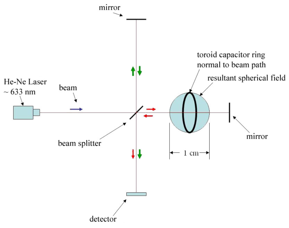 The only reported warp-field experiment currently being conducted is on a modified Michelson–Morley interferometer as proposed by Harold White and Eric Davis in 2003. This setup includes a ring-shaped energy device using high-voltage barium-titanate ceramic capacitors to attempt to warp space as shown in the diagram. White announced at a 2013 space conference that the first experimental results from this device were inconclusive.[1]