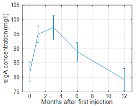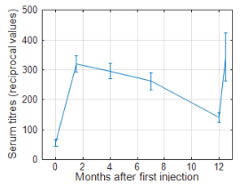 Milovanović and coworkers studied the serum antibody response of 97 women with trichomonad colpitis to primary immunization with SolcoTrichovac (3 intramuscular injections of 0.5 ml vaccine at intervals of 2 weeks) and a booster dose of 0.5 ml administered 12 months after the first injection.[45] The agglutination titres were determined by preparing two-fold serial dilutions of the serum samples in isotonic saline (dilutions of 1:10 to 1:1280), using 0.5 ml concentrated lactobacillus vaccine as an agglutinogen. An at least threefold elevation of the agglutination titres following primary immunization was detected in the serum of 93.8% of patients; the rest of the patients were considered non-responders or poor responders to the vaccination. The geometric mean of the agglutination titres increased from the basal level of 1:56 before vaccination to 1:320 after finishing the primary immunization program, and it was still 1:140 one year later. Two weeks after the booster injection the mean titres were raised back to 1:343.[45]