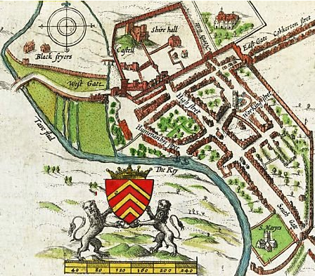 In 1536, the Laws in Wales Acts 1535–1542 between England and Wales led to the creation of the shire of Glamorgan, and Cardiff was made the county town. It also became part of Kibbor hundred. Around this same time the Herbert family became the most powerful family in the area.[22] In 1538, Henry VIII closed the Dominican and Franciscan friaries in Cardiff, the remains of which were used as building materials.[23] A writer around this period described Cardiff: "The River Taff runs under the walls of his honours castle and from the north part of the town to the south part where there is a fair quay and a safe harbour for shipping."[23]