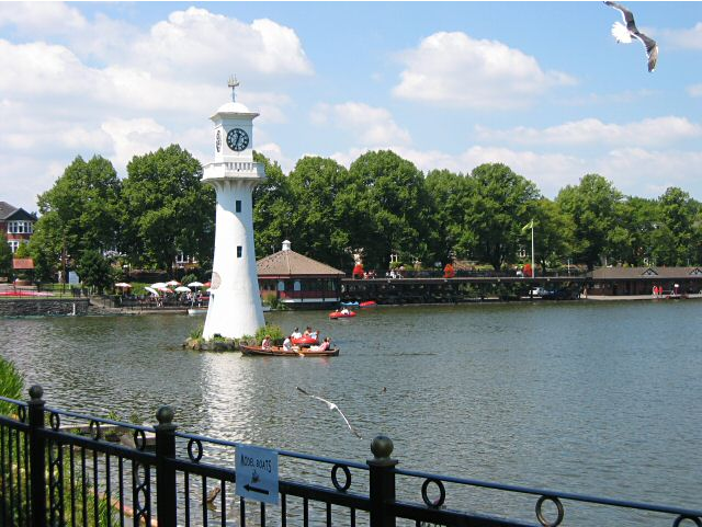 The lake at Roath Park, including the lighthouse erected as a memorial to Captain Scott https://handwiki.org/wiki/index.php?curid=1839847