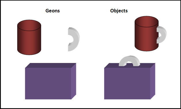 An extension of Marr and Nishihara's model, the recognition-by-components theory, proposed by Biederman (1987), proposes that the visual information gained from an object is divided into simple geometric components, such as blocks and cylinders, also known as "geons" (geometric ions), and are then matched with the most similar object representation that is stored in memory to provide the object's identification (see Figure 1).[11]