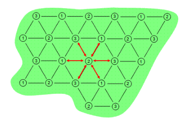 There are predominantly two electrical load arrangements for ERH: three-phase and six-phase. Three-phase heating consists of electrodes in a repeating triangular or delta pattern. Adjacent electrodes are of a different electrical phase so electricity conducts between them as shown in Figure 1. The contaminated area is depicted by the green shape while the electrodes are depicted by the numbered circles.
