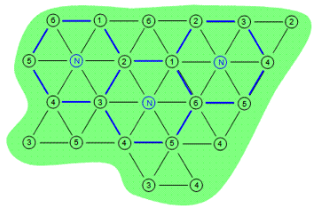 Six-phase heating consists of six electrodes in a hexagonal pattern with a neutral electrode in the center of the array. The six-phase arrays are outlined in blue in Figure 2 below. Once again the contaminated area is depicted by the green shape while the electrodes are depicted by the numbered circles. In a six-phase heating pattern there can be hot spots and cold spots depending on the phases that are next to each other. For this reason, six-phase heating typically works best on small circular areas that are less than 65 feet in diameter.