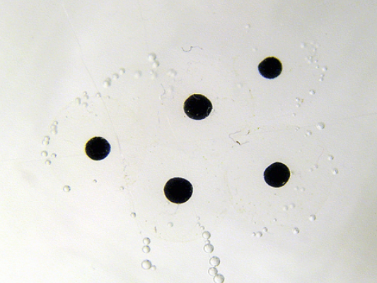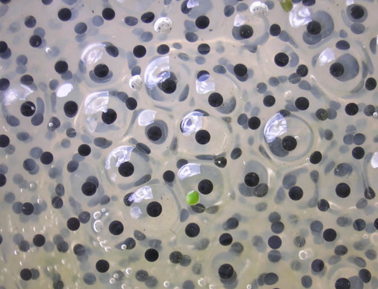 In certain species, such as the wood frog (Rana sylvatica), symbiotic unicellular green algae are present in the gelatinous material. It is thought that these may benefit the developing larvae by providing them with extra oxygen through photosynthesis.[135] The interior of globular egg clusters of the wood frog has been also been found to be up to 6 °C (11 °F) warmer than the surrounding water and this speeds up the development of the larvae.[136] The larvae developing in the eggs can detect vibrations caused by nearby predatory wasps or snakes, and will hatch early to avoid being eaten.[137] In general, the length of the egg stage depends on the species and the environmental conditions. Aquatic eggs normally hatch within one week when the capsule splits as a result of enzymes released by the developing larvae.[138]
