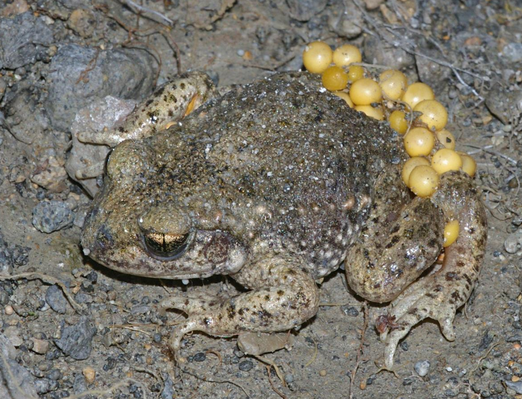 The spadefoot toads of North America are also adapted to underground life. The Plains spadefoot toad (Spea bombifrons) is typical and has a flap of keratinised bone attached to one of the metatarsals of the hind feet which it uses to dig itself backwards into the ground. As it digs, the toad wriggles its hips from side to side to sink into the loose soil. It has a shallow burrow in the summer from which it emerges at night to forage. In winter, it digs much deeper and has been recorded at a depth of Lua error: Internal error: The interpreter exited with status 1..[112] The tunnel is filled with soil and the toad hibernates in a small chamber at the end. During this time, urea accumulates in its tissues and water is drawn in from the surrounding damp soil by osmosis to supply the toad's needs.[112] Spadefoot toads are "explosive breeders", all emerging from their burrows at the same time and converging on temporary pools, attracted to one of these by the calling of the first male to find a suitable breeding location.[113]