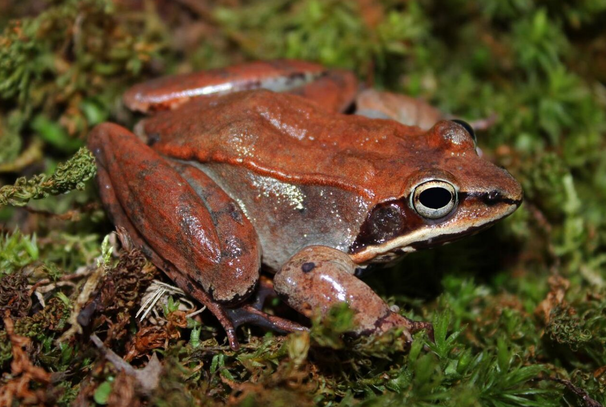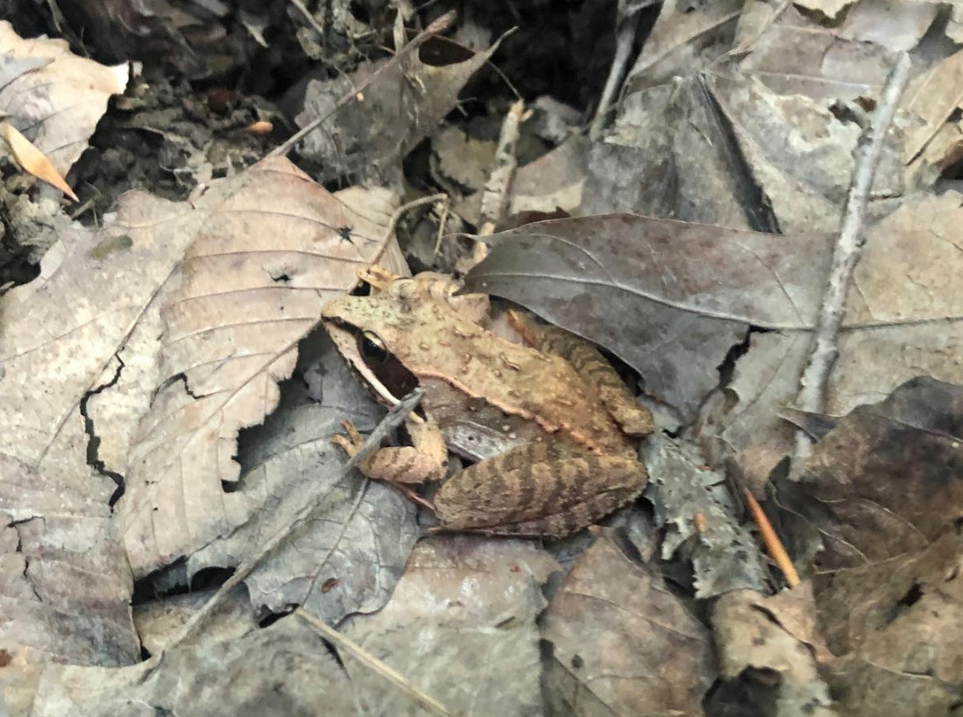 Wood Frog:(Lithobates sylvaticus or Rana sylvatica) uses disruptive coloration including black eye markings similar to voids between leaves, bands of the dorsal skin (dorsolateral dermal plica) similar to a leaf midrib as well as stains, spots & leg stripes similar to fallen leaf features. https://handwiki.org/wiki/index.php?curid=1627700