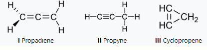 In two of the isomers, the three carbon atoms are connected in an open chain, but in one of them (propadiene or allene; I) the carbons are connected by two double bonds, while in the other (propyne or methylacetylene, II) they are connected by a single bond and a triple bond. In the third isomer (cyclopropene; III) the three carbons are connected into a ring by two single bonds and a double bond. In all three, the remaining valences of the carbon atoms are satisfied by the four hydrogens.
