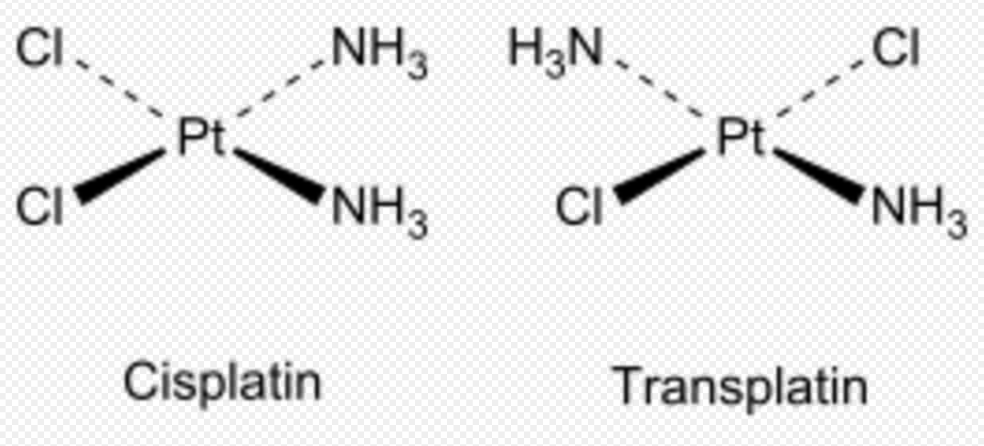 As an inorganic example, cisplatin (see structure above) is an important drug used in cancer chemotherapy, whereas the trans isomer (transplatin) has no useful pharmacological activity.