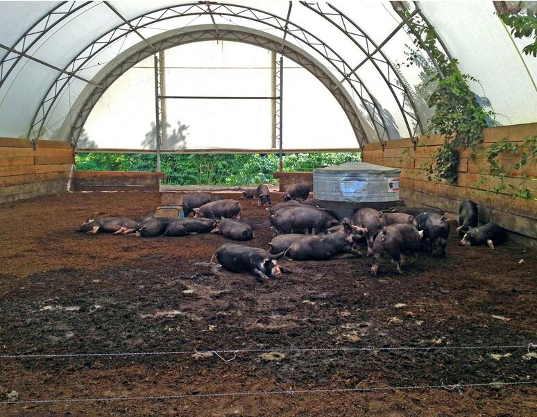 Simple structures originally developed in Canada, built at low cost, approximately a $4 (USD) reduction per pig. These structures allow for low-odor, high ventilation, but in colder temperate zones, hoop buildings present challenges for producers to overcome, including proper bedding and disease management.[7] They are used by organic and conventional producers alike to manage large fluctuations of pig flow numbers for larger systems.[8] Traditional barn structures, with access to both indoor and outdoor environments are also common systems for producers.