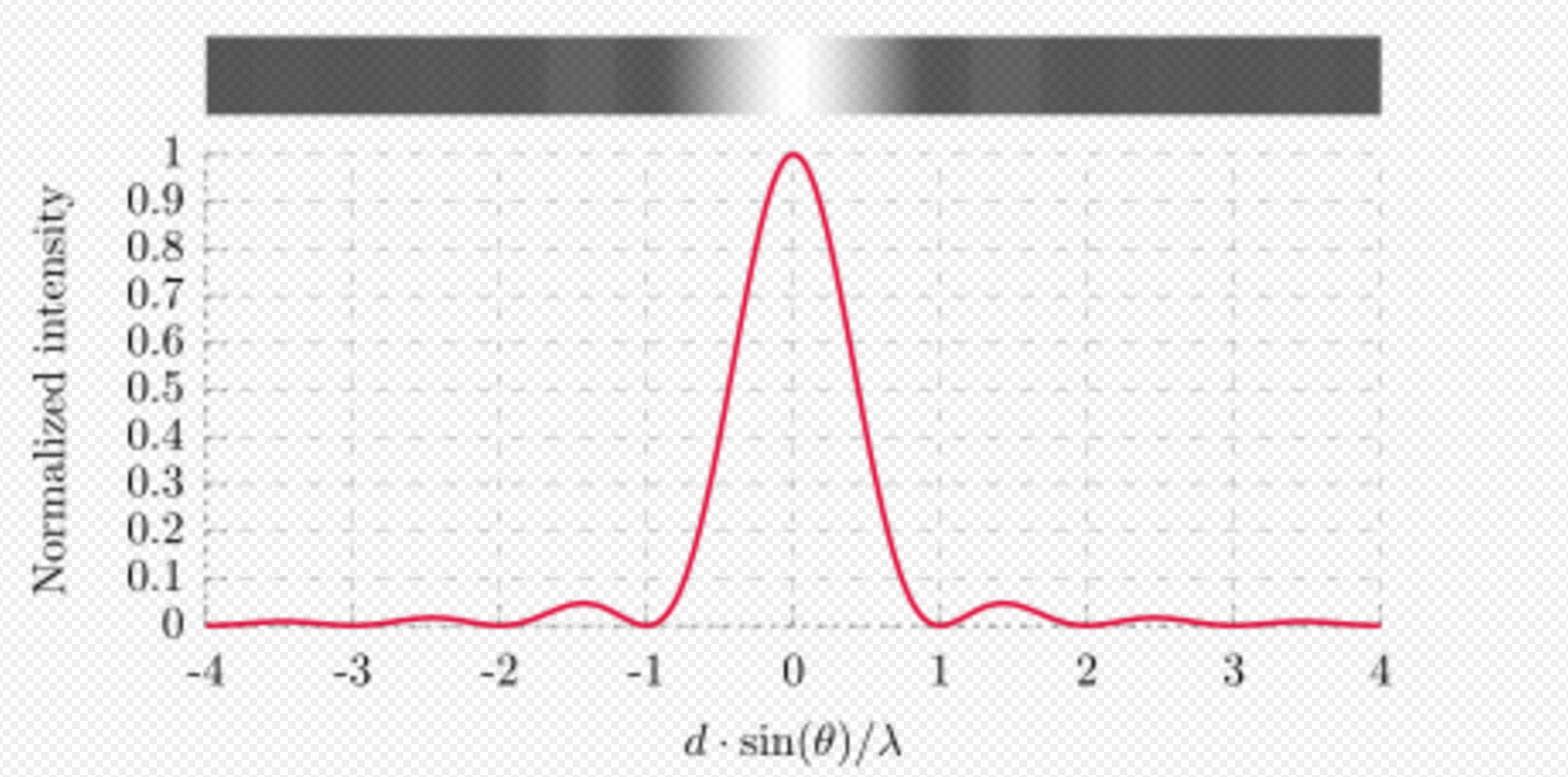 | [math]\displaystyle{ I(\theta)\, }[/math] | [math]\displaystyle{ = I_0 {\left[ \operatorname{sinc} \left( \frac{\pi a}{\lambda} \sin \theta \right) \right] }^2 }[/math] |
