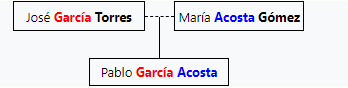 In Spain and in most Spanish-speaking countries, the custom is for people to have two surnames. Usually the first surname comes from the father and the second from the mother, but it could be the other way round. When speaking or in informal situations only the first one is used, although both are needed for legal purpose. A child's first surname will usually be their father's first surname, while the child's second surname will usually be the mother's first surname. For example, if José García Torres and María Acosta Gómez had a child named Pablo, then his full name would be Pablo García Acosta. One family member's relationship to another can often be identified by the various combinations and permutations of surnames.