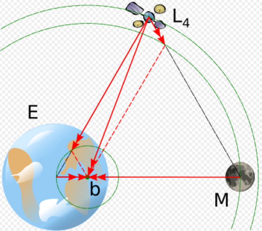 Satellites are stable at the L4 and L5 Lagrangian points. These lie at the third corners of the two equilateral triangles in the plane of orbit whose common base is the line between the centers of the two masses, such that the point lies behind (L5) or ahead (L4) of the smaller mass with regard to its orbit around the larger mass. The triangular points (L4 and L5) are stable equilibria, provided that the ratio of M1/M2 is nearly 24.96.[1][2] When a body at these points is perturbed, it moves away from the point, but the factor opposite of that which is increased or decreased by the perturbation (either gravity or angular momentum-induced speed) will also increase or decrease, bending the object's path into a stable, kidney-bean-shaped orbit around the point (as seen in the corotating frame of reference).