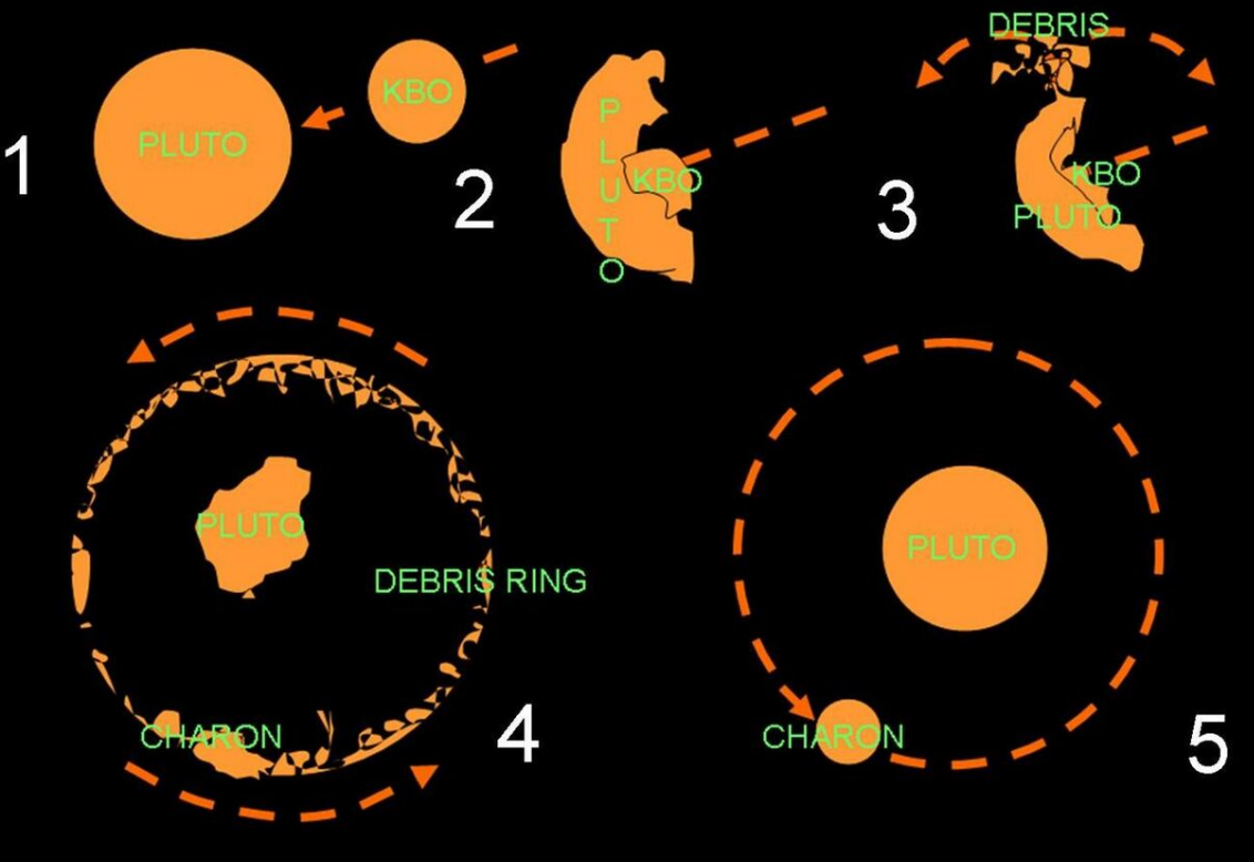 Collision is one of the leading theories for the formation of satellite systems, particularly those of the Earth and Pluto. Objects in such a system may be part of a collisional family and this origin may be verified comparing their orbital elements and composition. Computer simulations have been used to demonstrate that giant impacts could have been the origin of the Moon. It is thought that early Earth had multiple moons resulting from the giant impact. Similar models have been used to explain the creation of the Plutonian system as well as those of other Kuiper belt objects and asteroids. This is also a prevailing theory for the origin of the moons of Mars.[10] Both sets of findings support an origin of Phobos from material ejected by an impact on Mars that reaccreted in Martian orbit.[11] Collision is also used to explain peculiarities in the Uranian system.[12][13] Models developed in 2018 explain the planet's unusual spin support an oblique collision with an object twice the size of Earth which likely to have re-coalesced to form the system's icy moons.[14]