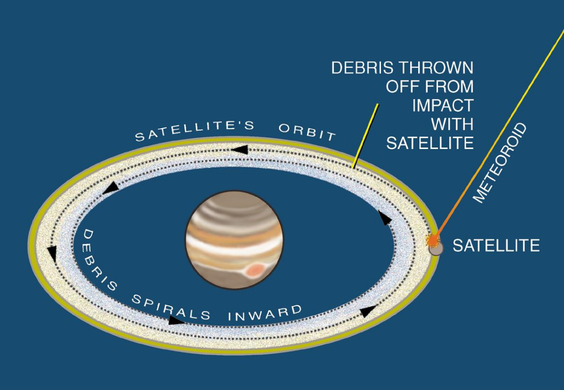 Another proposed mechanism for satellite system formation is accretion from debris. Scientists theorise that the Galilean moons are thought by some to be a more recent generation of moons formed from the disintegration of earlier generations of accreted moons.[9] Ring systems are a type of circumplanetary disk that can be the result of satellites disintegrated near the Roche limit. Such disks could, over time, coalesce to form natural satellites.