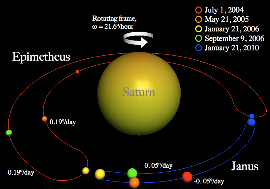 Other possible orbital interactions include libration and co-orbital configuration. The Saturnian moons Janus and Epimetheus share their orbits, the difference in semi-major axes being less than either's mean diameter. Libration is a perceived oscillating motion of orbiting bodies relative to each other. The Earth-moon satellite system is known to produce this effect.
