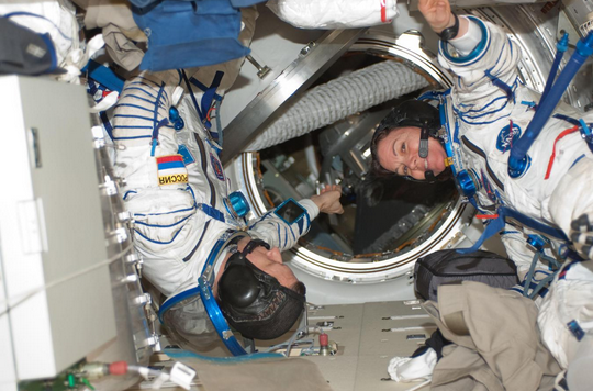Kondratyev and Coleman prepare to perform a fit check inside the Soyuz. https://handwiki.org/wiki/index.php?curid=1212933