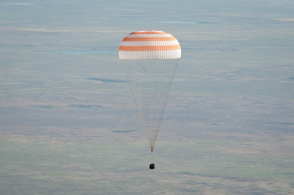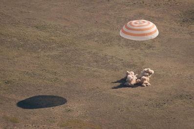 The re-entry was conducted without any significant problems. In stark contrast to the frigid cold temperatures prevailed on the previous Soyuz TMA-01M landing day, the weather this time was sunny and warm. Soyuz TMA-20's large parachute and smaller drogue chute inflated as planned, and the spacecraft descended towards its landing zone near Dzhezkazgan in Kazakhstan. The safe landing of the descent module was supervised by Russian Search and Recovery forces on board three Antonov 12 and Antonov 26 planes, 14 Mi-8 helicopters and seven search and recovery vehicles, deployed in the landing zone.[12] The final moments of the touchdown were recorded by NASA TV, with live landing footage and commentary.