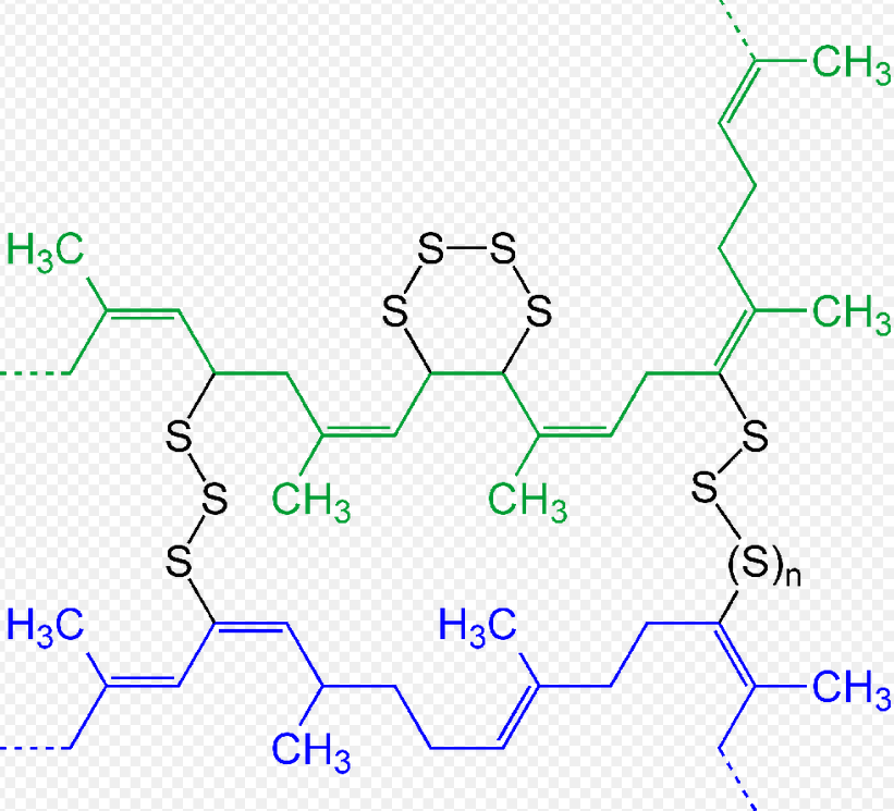 In rubber, the curing is also induced by the addition of a crosslinker. The resulting process is called sulfur vulcanization. Sulfur breaks down to form polysulfide cross-links (bridges) between sections of the polymer chains. The degree of crosslinking determines the rigidity and durability, as well as other properties of the material.[5]