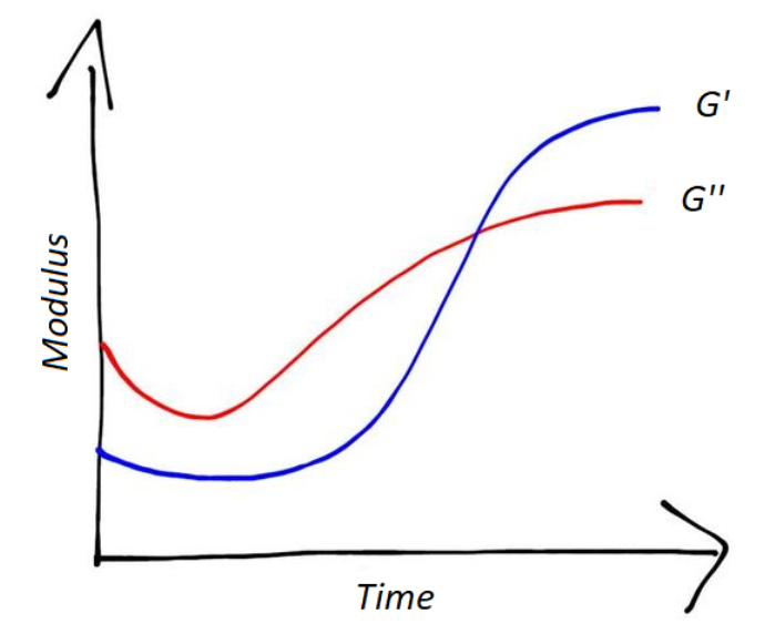 As shown in Figure 4, after an "induction time”, G' and G" start to increase, with an abrupt change in slope. At a certain point they cross each other; afterwards, the rates of G' and G" decrease, and the moduli tend to a plateau. When they reach the plateau the reaction is concluded.[1]