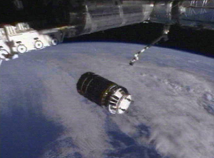 While passing above the Pacific Ocean, the robotic arm of the space station released the HTV-1 positioned at 12 kilometres (7.5 mi) below the station on 30 October 2009. The departure was delayed for one ISS orbit to avoid debris (Kosmos 2421).[26][27] HTV-1 was loaded with 199 items of discarded equipment and waste of 727.7 kilograms (1,604 lb), as well as 896 kilograms (1,975 lb) empty racks, totaling 1,624 kilograms (3,580 lb).[27] At 17:32 (UTC), HTV-1 was released from SSRMS and began its planned maneuvers to leave the station proximity. HTV-1 gradually departed from the ISS orbit by performing several thruster burns and entered to its solo-flight mode.