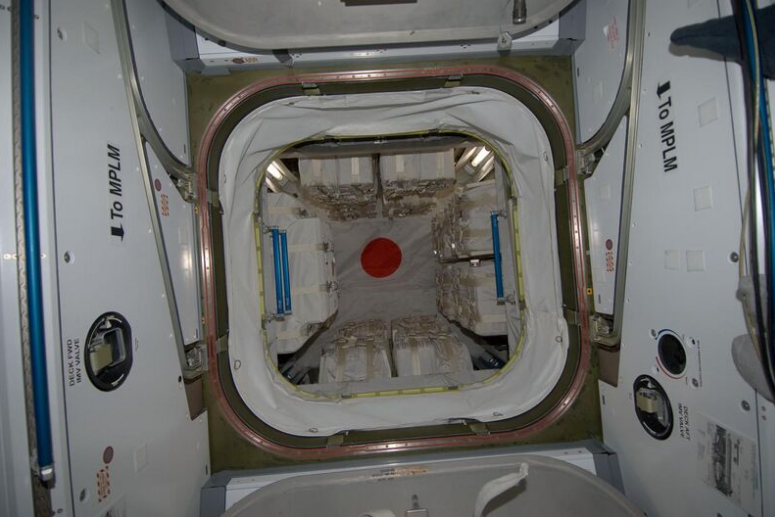 The view of HTV-1 through the Common Berthing Mechanism (CBM port). Multi-Purpose Logistics Module (MPLM) on the Harmony module refers to a cargo container that uses the same berth.