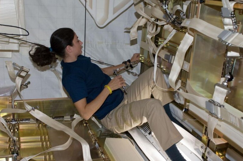 The NASA astronaut Nicole Stott working inside HTV-1, 8 days later, with some supplies already removed.