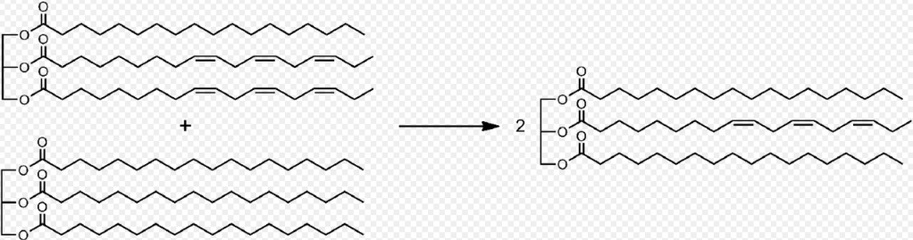 Fats such as soybean oil consist mainly of various triglycerides which are made up of a glycerol backbone esterified to three fatty acid molecules. The triglycerides contain a mixture of saturated, monounsaturated, and polyunsaturated fatty acids. Interesterification is carried out by blending the desired oils and then rearranging the fatty acids over the glycerol backbone with, for instance, the help of catalysts or lipase enzymes.[1] Polyunsaturated fatty acids (PUFAs) decrease the melting point of fats significantly. A triglyceride containing three saturated fatty acids is generally solid at room temperature and not very desirable for many applications. Rearranging these triglycerides with oils containing unsaturated fatty acids lowers the melting point and creates fats with properties better suited for target food products. In addition, blending interesterified oils with liquid oils allows the reduction in saturated fatty acids in many trans fatty acid free food products. The interesterified fats can be separated through controlled crystallization, also called fractionation.[2]