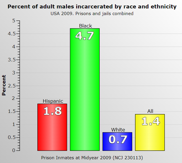 A 2012 report by the United States Sentencing Commission found that drug sentences for black men were 13.1 percent longer than drug sentences for white men between 2007 and 2009.[36]